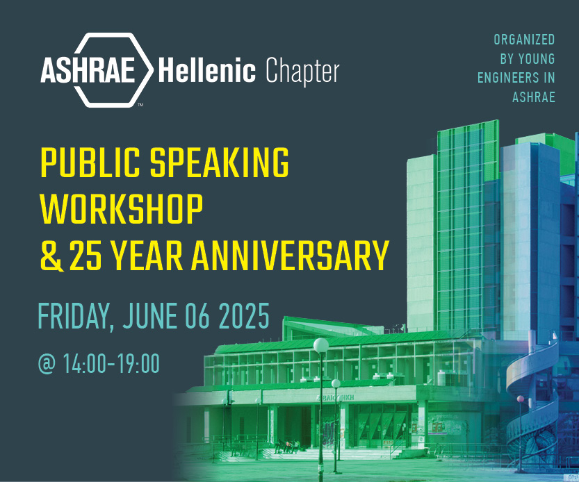We welcome you to our Workshop organized by Young Engineers in ASHRAE (YEA) “Public Speaking Workshop & 25 Year Anniversary – YEA”! It will take place Central Library of National Technical University of Athens on Friday June 06, 2025.